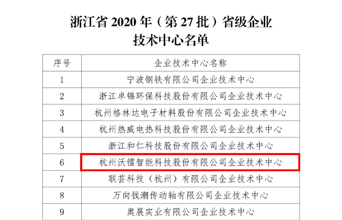 近日,浙江省經(jīng)濟(jì)和信息化廳公布了浙江省2020年(第27批)省級(jí)企業(yè)技術(shù)中心名單,沃鐳智能喜獲“浙江省企業(yè)技術(shù)中心”榮譽(yù)稱號(hào)。