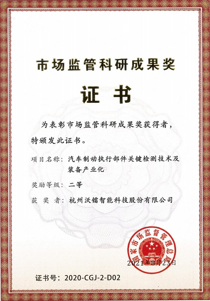 本次會(huì)議頒發(fā)了首屆市場(chǎng)監(jiān)管科研成果獎(jiǎng),其中,杭州沃鐳智能科技股份有限公司研究的“汽車(chē)制動(dòng)執(zhí)行部件關(guān)鍵檢測(cè)技術(shù)及裝備產(chǎn)業(yè)化”科研成果獲得二等獎(jiǎng)。