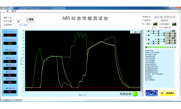 檢測臺由封堵夾具、測試系統(tǒng)、數(shù)據(jù)采集系統(tǒng)以及質(zhì)量追溯系統(tǒng)組成,配置有產(chǎn)品裝夾機(jī)構(gòu)、產(chǎn)品封堵及配氣機(jī)構(gòu)、產(chǎn)品配電機(jī)構(gòu)、氣壓測試系統(tǒng)、數(shù)據(jù)采集及分析系統(tǒng)等。測試臺采用高壓氮?dú)庾鳛闇y試介質(zhì),改變傳統(tǒng)的制動液測試,減少制動液對產(chǎn)品及生產(chǎn)環(huán)境的影響。通過密封性測試、電磁閥響應(yīng)測試、柱塞泵功能測試、蓄能器活塞測試等相關(guān)的部件功能測試和總成功能測試實(shí)現(xiàn)產(chǎn)品的性能判斷。